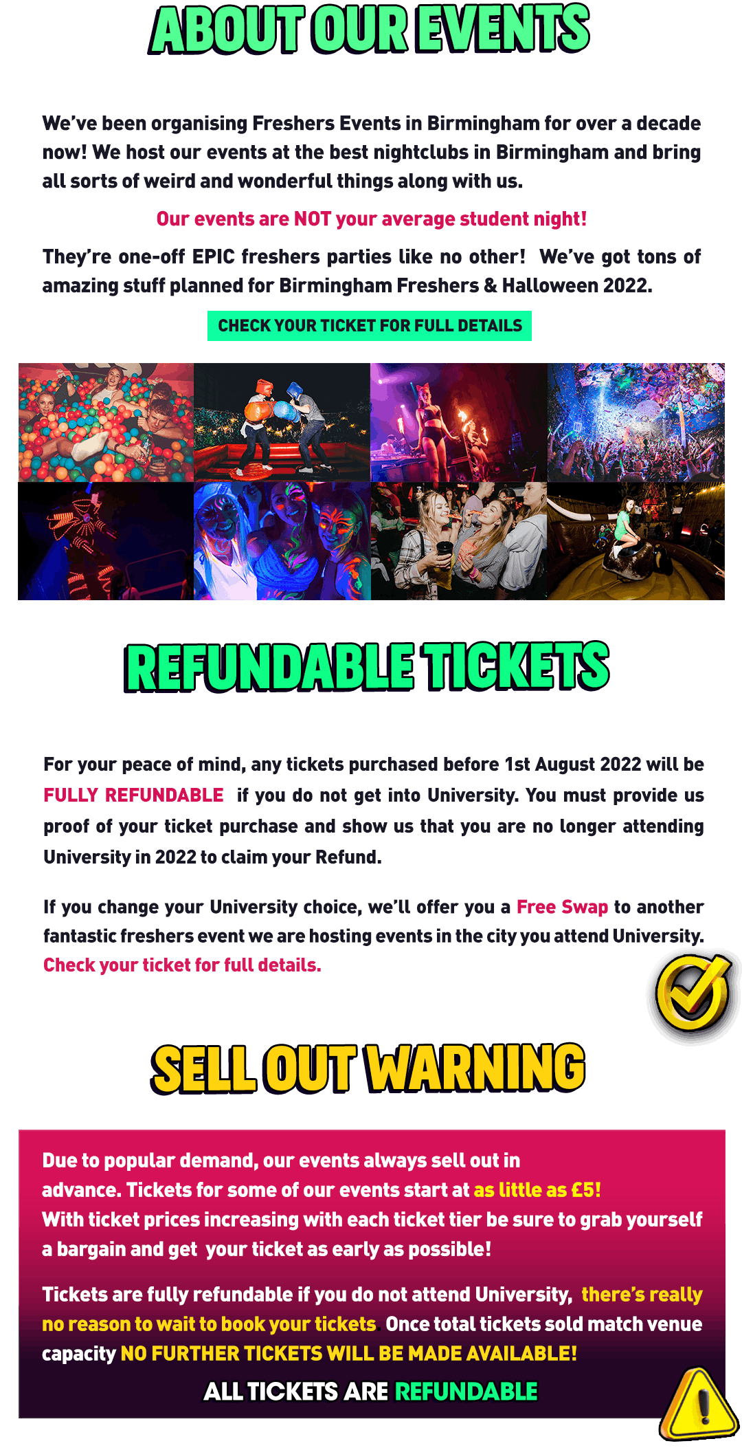 We would like our customers to have peace of mind when they purchase from us. Therefore, in the case that freshers events do not take place in September due to nightclubs/bars still remaining closed, we will issue a FULL refund to any ticket or wristband you have purchased.